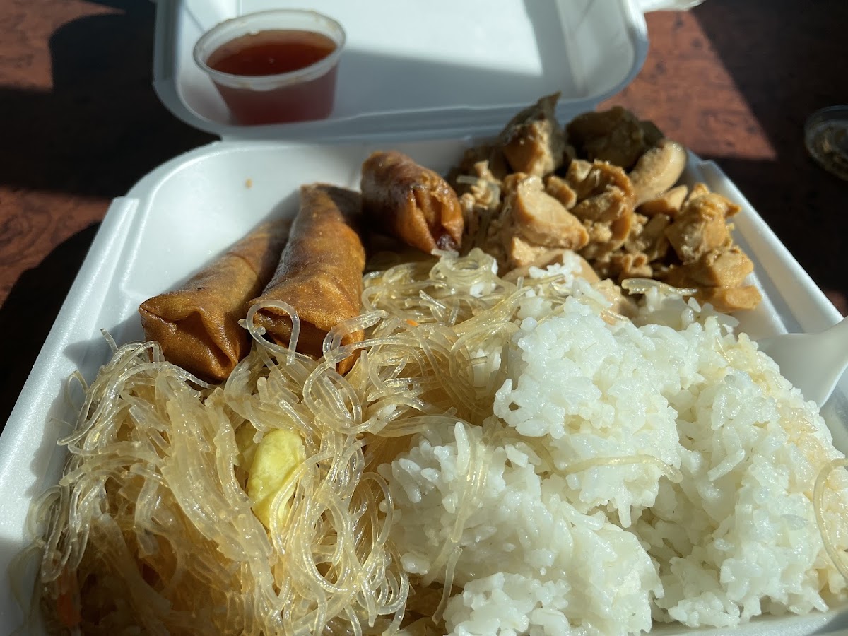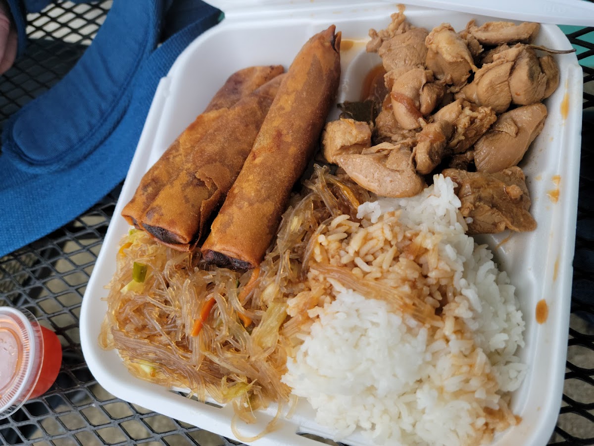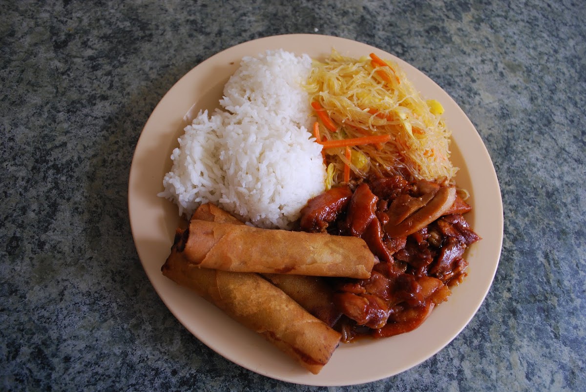 Comes with three pieces lumpia, pancit and rice (fried or white).